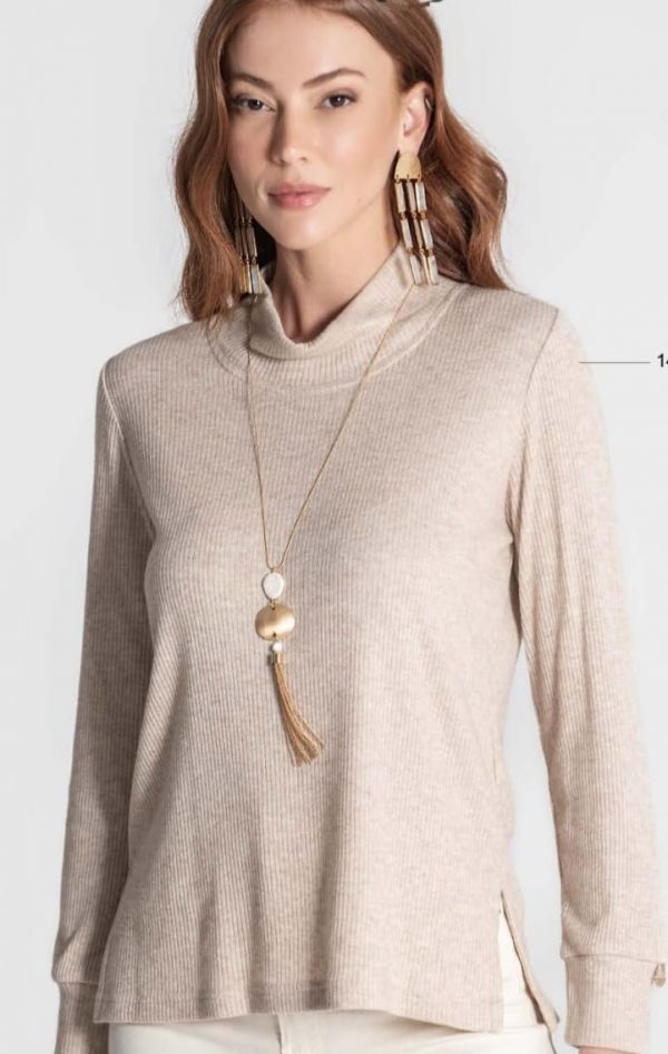 Camiseta cálida de canalé  con cuello desmontable y tallaje generoso.  Composición viscosa 49%, poliester 25%, poliamida 21% y elastano 5%.