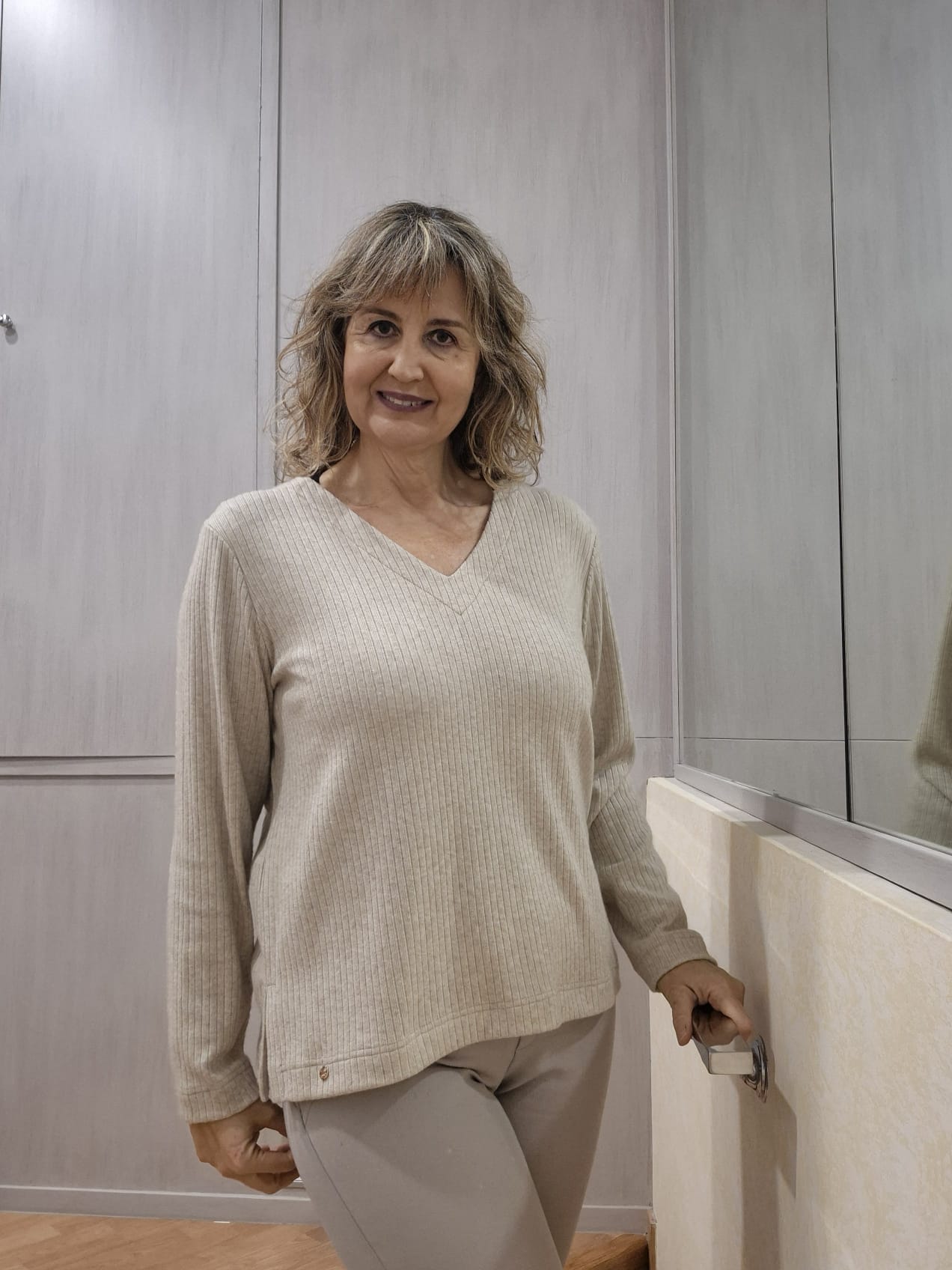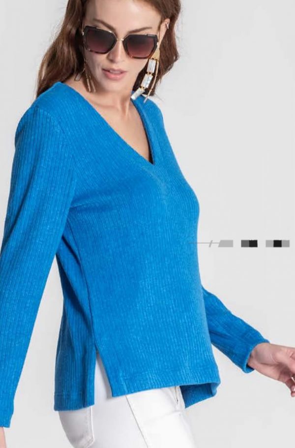 Camiseta cálida de canalé con cuello desmontable y tallaje generoso. Composición viscosa 49%, poliester 25%, poliamida 21% y elastano 5%.