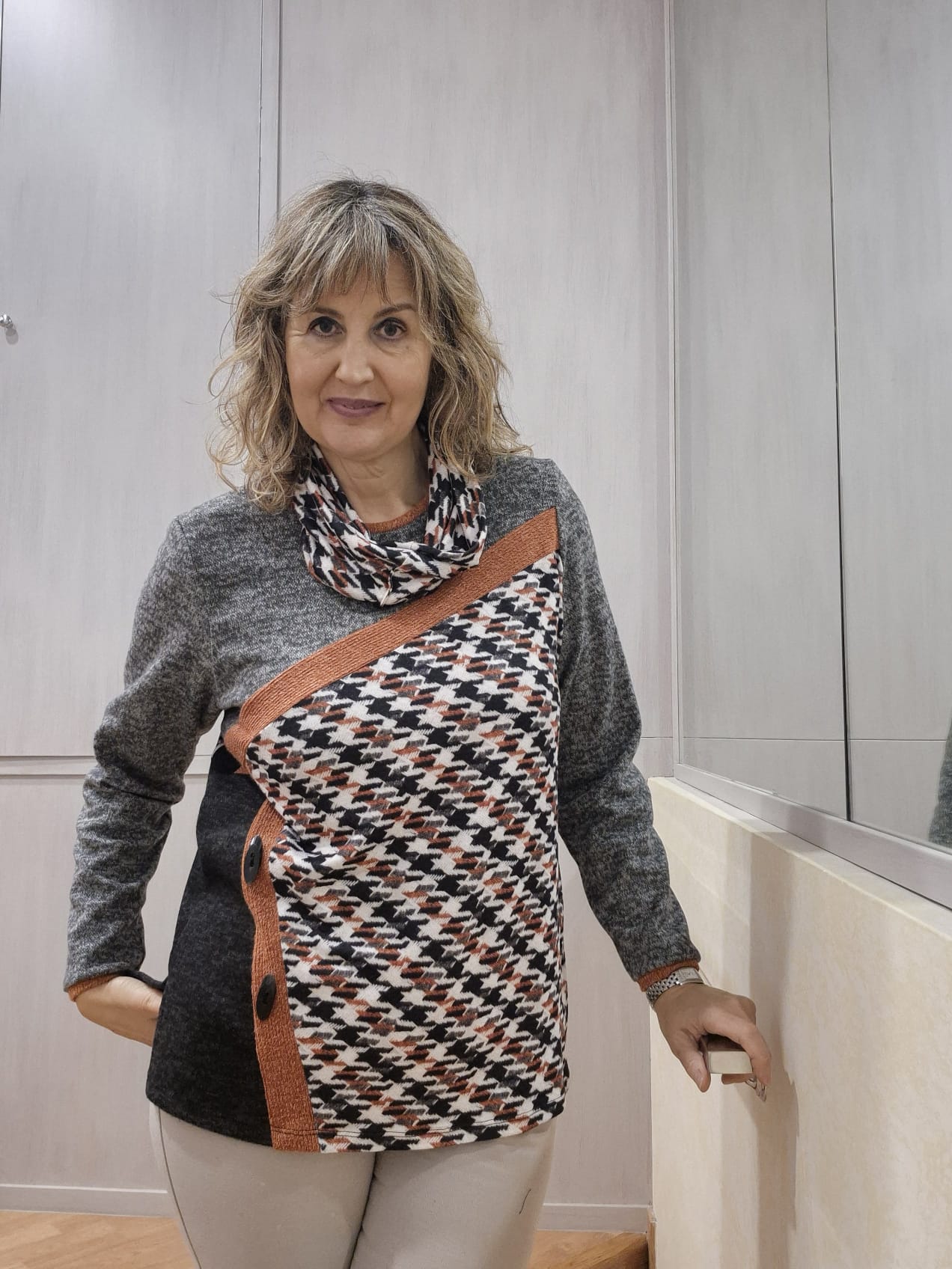 Conjunto de punto cálido de cuello desmontable y tallaje generoso. Composición poliester 100%.
