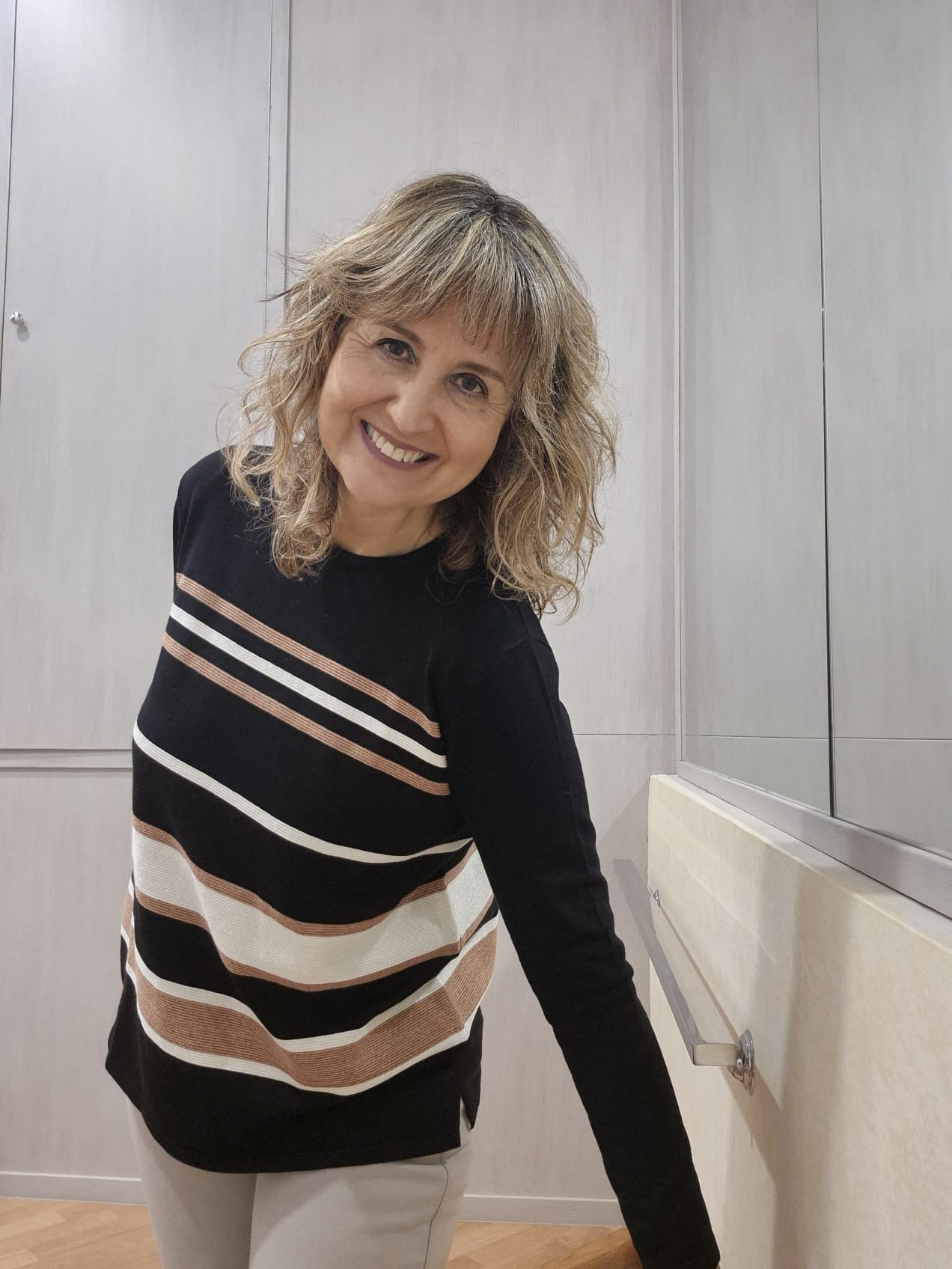 Jersey con un leve brillo en las rayas. Composición viscosa 87%, nylon 10% y lurex 3%.