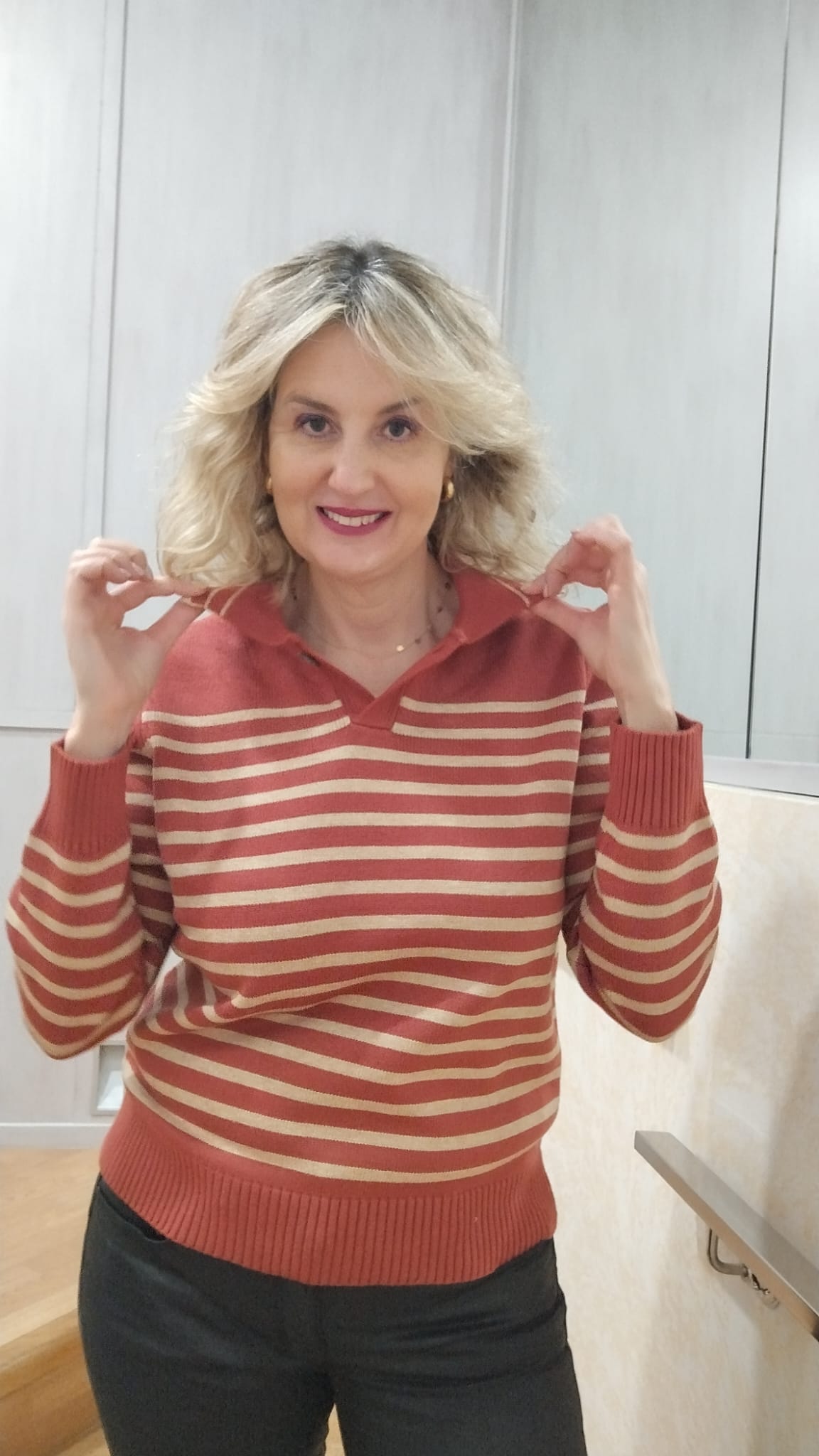 Jersey con cuello polo. Comp0sición viscosa 50%, poliester 28% y poliamida 22%.