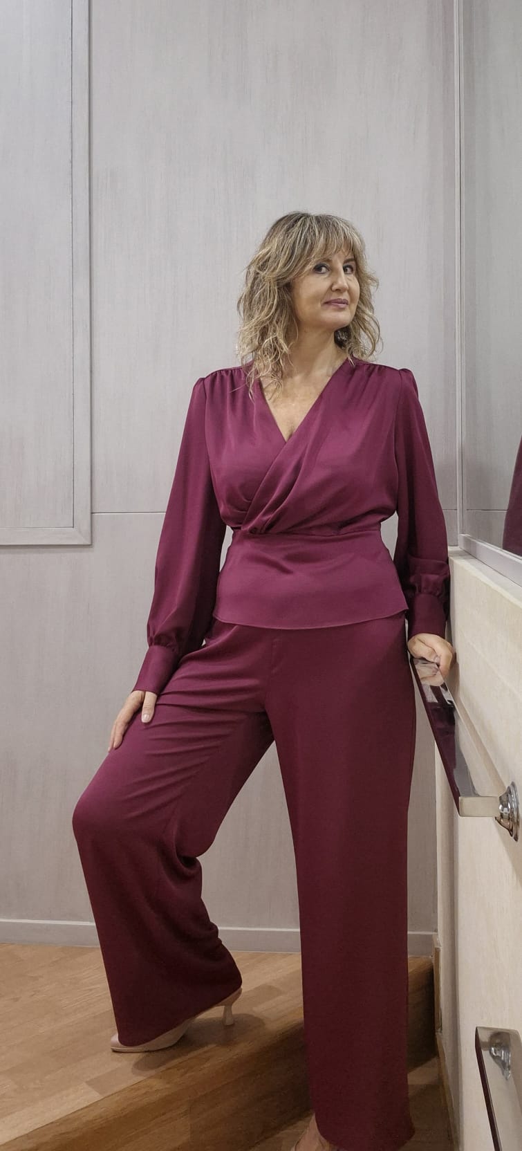 Conjunto de pantalón de tela satinada. Pantalón con gomas en la cintura. Composición poliester 100%.