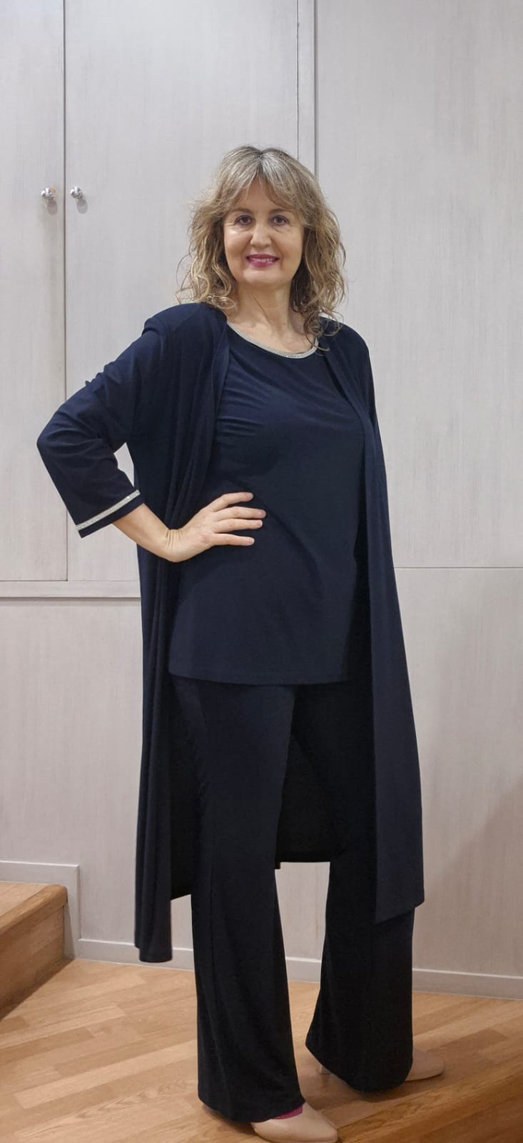Traje de pantalón con blusa de manga corta. Tejido es crepe elástico. La cintura del pantalón es de goma. Composición poliester 95% y elastano 5%.