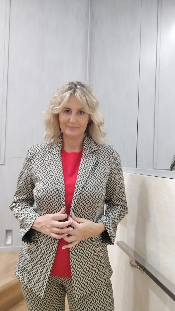 Traje de pantalón de dibujos geométricos . Composición poliester 70%, poliamida 25% y elastano 5%.