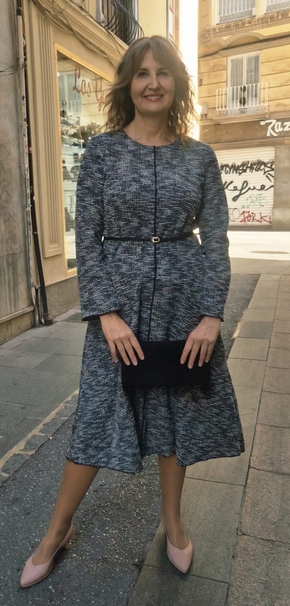Vestido midi con tejido con un ligero brillo. Composición poliester 78%, lurex 1% , algodón 19% y elastano 2%.